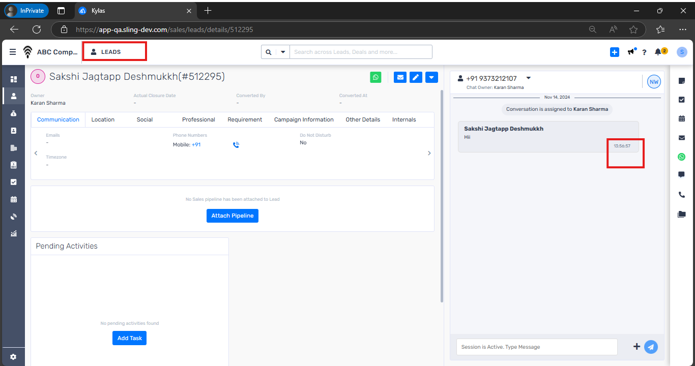 As you want to create leads in the Kylas using WhatsApp business number, so If you receive a WhatsApp message from any unknown number or if the lead is not already existing in the Lead/Contact list, then Lead will automatically gets created in your Lead list.