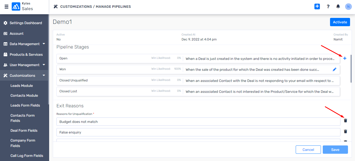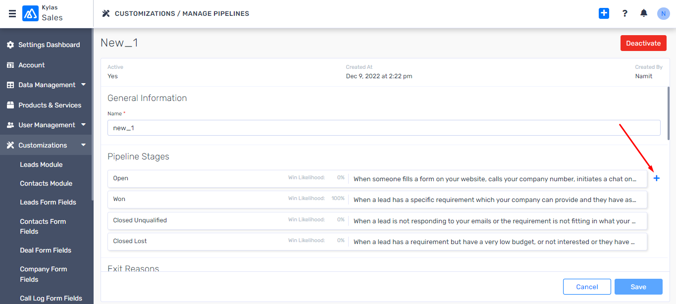 Click on either delete to remove unused exit reasons or "+" to add new pipeline stage